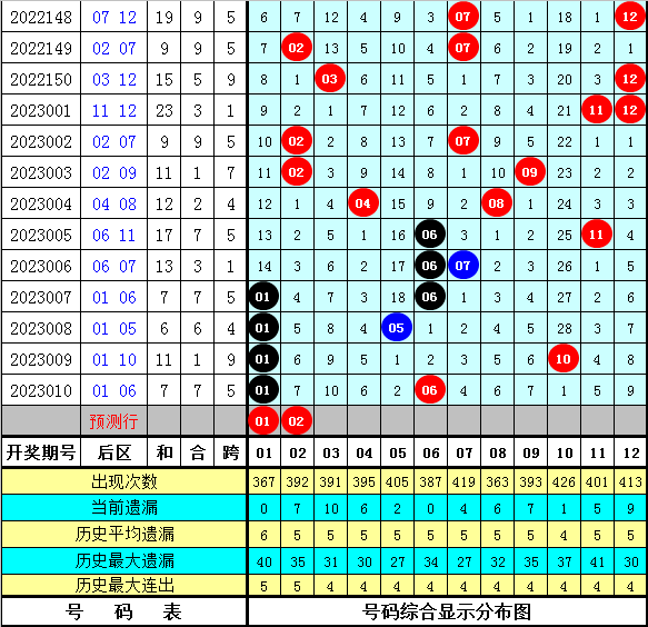 上期开奖:体彩大乐透第2023010期开出奖号为:05 06 13 23 26 + 01 06,其中前区奖号和值为73,首尾间距为21,奇偶比为3:2,大小比为2:3,012路比为1:1:3,后区奖号为:一奇一偶、全小组合。