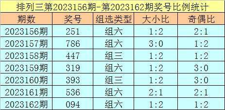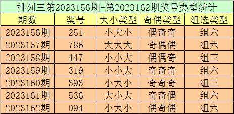 排列三第2023162期回顾:奖号094,奇偶比1:2,大小比1:2,和值13,类型:组六。