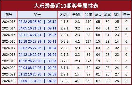 开奖回顾:第24022期大乐透奖号为07 09 11 31 32 + 04、08。区间比:3:0:2,奇偶比:4:1,首尾间距:25。