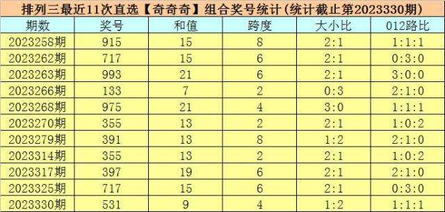 排列三上期奖号为531,开出奇偶类型为【奇奇奇】,前10次【奇奇奇】类型奖号分别开出:915、717、993、133、975、355、391、355、397、717;