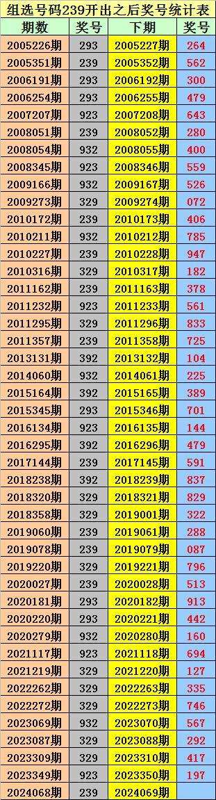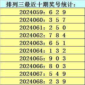 上期回顾:排列三第2024068期开奖号码为239,历史上组选出现44次,直选出现11次。