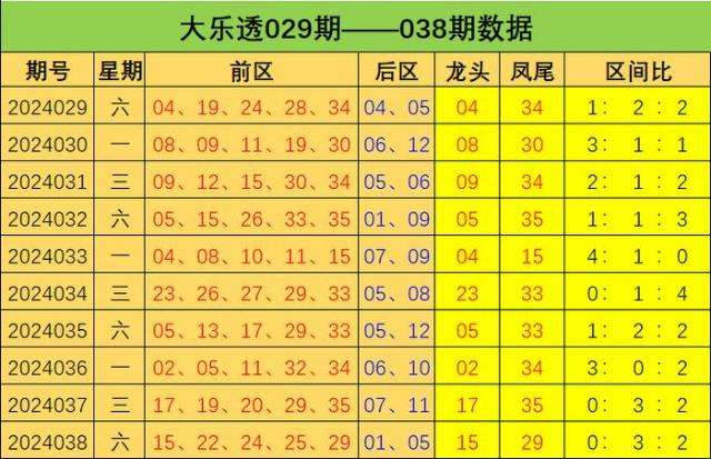大乐透第2024038期出奖号统计:前区15 22 24 25 29,后区01、05,和值为115,跨度14,龙头15凤尾29,三区比为0:3:2,012路比为2:2:1,奇偶比为3:2,大小比为4:1,冷热比为3:2,1枚重号,1组连号。