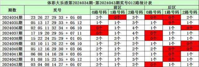上期回顾:大乐透第24043期奖号为:03 04 08 14 27+05 07,其中前区号码012路比为2:1:2,后区号码012路比为0:1:1。