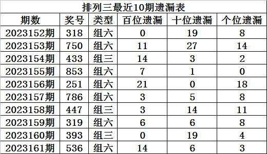 上期回顾:排列三第2023161期奖号:536,组六,直选遗漏总值为23期。