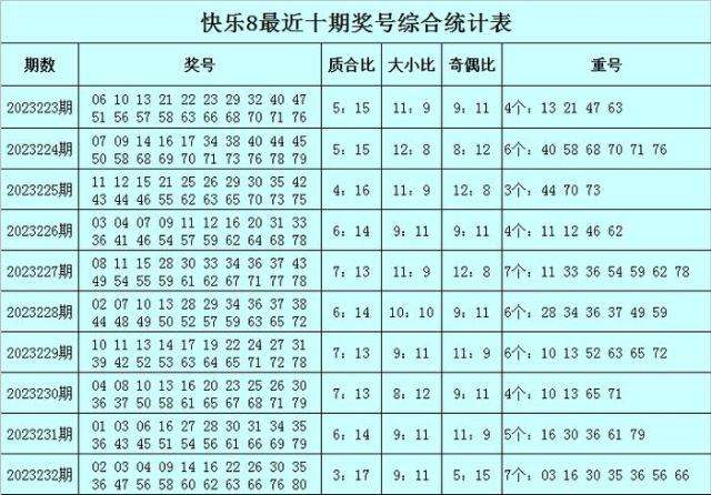 福彩快乐8第2023232期开出奖号:02 03 04 09 14 16 22 26 30 35 36 47 56 58 60 62 63 66 76 80,其中奖号质合比为3:17,四区比为6:5:4:5,包含7个重号03、16、30、35、36、56、66,包含连码02 03 04、35 36、62 63,,包含6个邻号02 04 26 60 62 80。