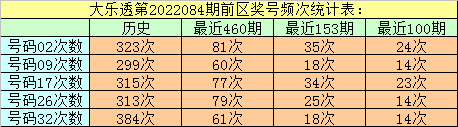 万妙仙大乐透第2022084期前区热号分析:(统计最近460期数据)
