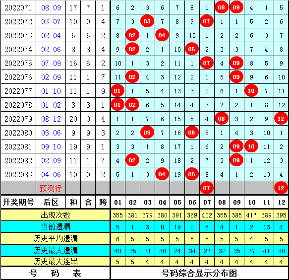 本期后区注意四码01、02、07、12,单挑两码07、12。