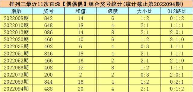 上期回顾:排列三第2022094期开出奖号488,其中奇偶比为0:3,大小比为2:1,012路比为0:1:2,和值为20,跨度为4。