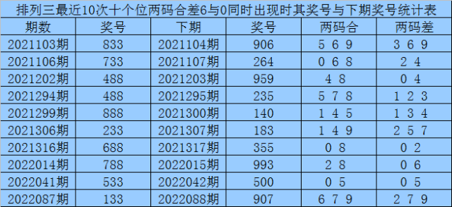 从以上统计可以看出,十个位两码合差6与0同时出现之后其下期两码合差表现最热的4个分别为:0245,本期十个位两码合差可以参考这四码中的数据。
