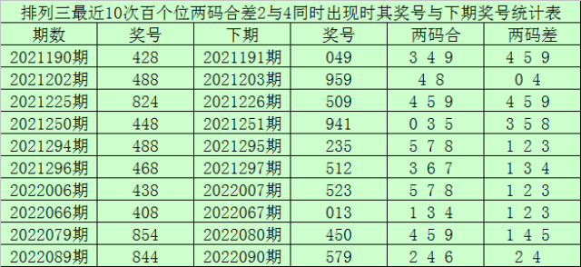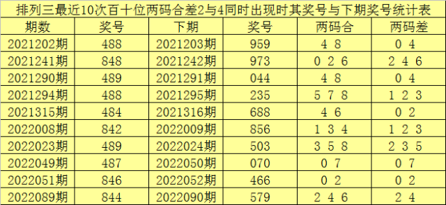 百个位合差分析:上期奖号百个位开出48组合,两码合为2,两码差为4,最近10次百个位两码合2与两码差4同时出现时,其奖号和下期奖号分别为: