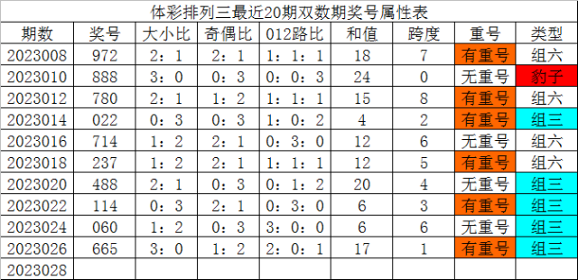 体彩排列三最近20期双数期奖号分别为:972、888、780、022、714、237、488、114、060、665,各期奖号详细属性下表: