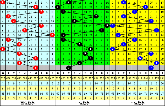 其中,号码0-9开出次数分别为:号码0开出3次、1开出4次、2开出2次、3开出4次、4开出4次、5开出2次、6开出3次、7开出3次、8开出3次、9开出2次。
