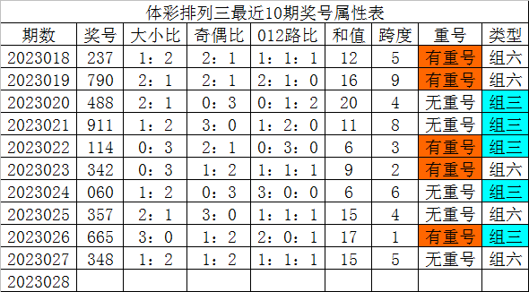 体彩排列三最近10期分别开出奖号:237、790、488、911、114、342、060、357、665、348,各奖号属性详见下表: