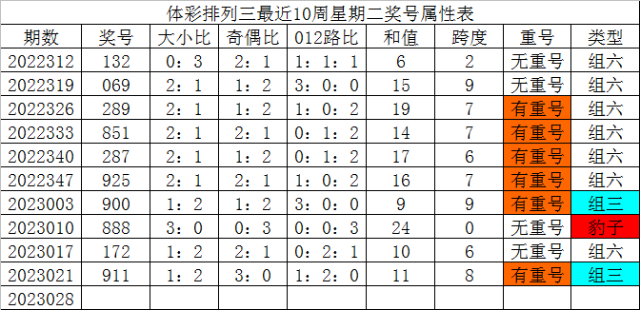 体彩排列三最近10周星期二奖号分别为:132、069、289、851、287、925、900、888、172、911,各奖号属性详见下表: