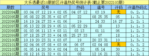孟浩然体彩大乐透第2022104期奖号冷温热码统计(冷码:遗漏9期以上的号码,温码:遗漏4-9期的号码,热码:遗漏0-3期的号码)