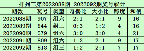 前10次直选022组合出现之后,其下期奖号分别为:316、925、143、355、731、336、922、402、854、946,其中奖号012路总比例为13:8:9,大小总比例为12:18,奇偶总比例为17:13。