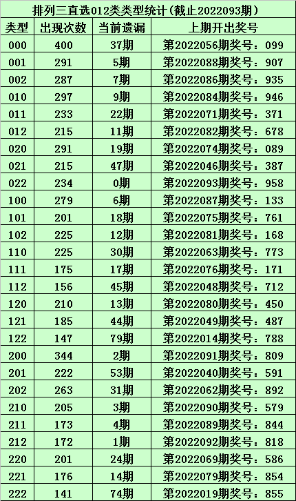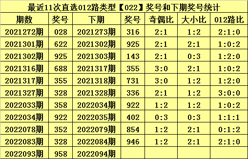 上期回顾:体彩排列三第2022093期开出奖号:958,其012路比为1:0:2,奖号012路类型为:022。