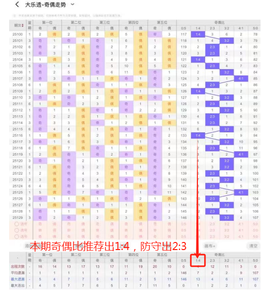 4、奇偶比:上期开出3个奇数03 09 35,出2个偶数14 28,奇偶比为3:2,整体看奇数强势,本期重点看偶数出号,本期推荐出2:3,防守出1:4。