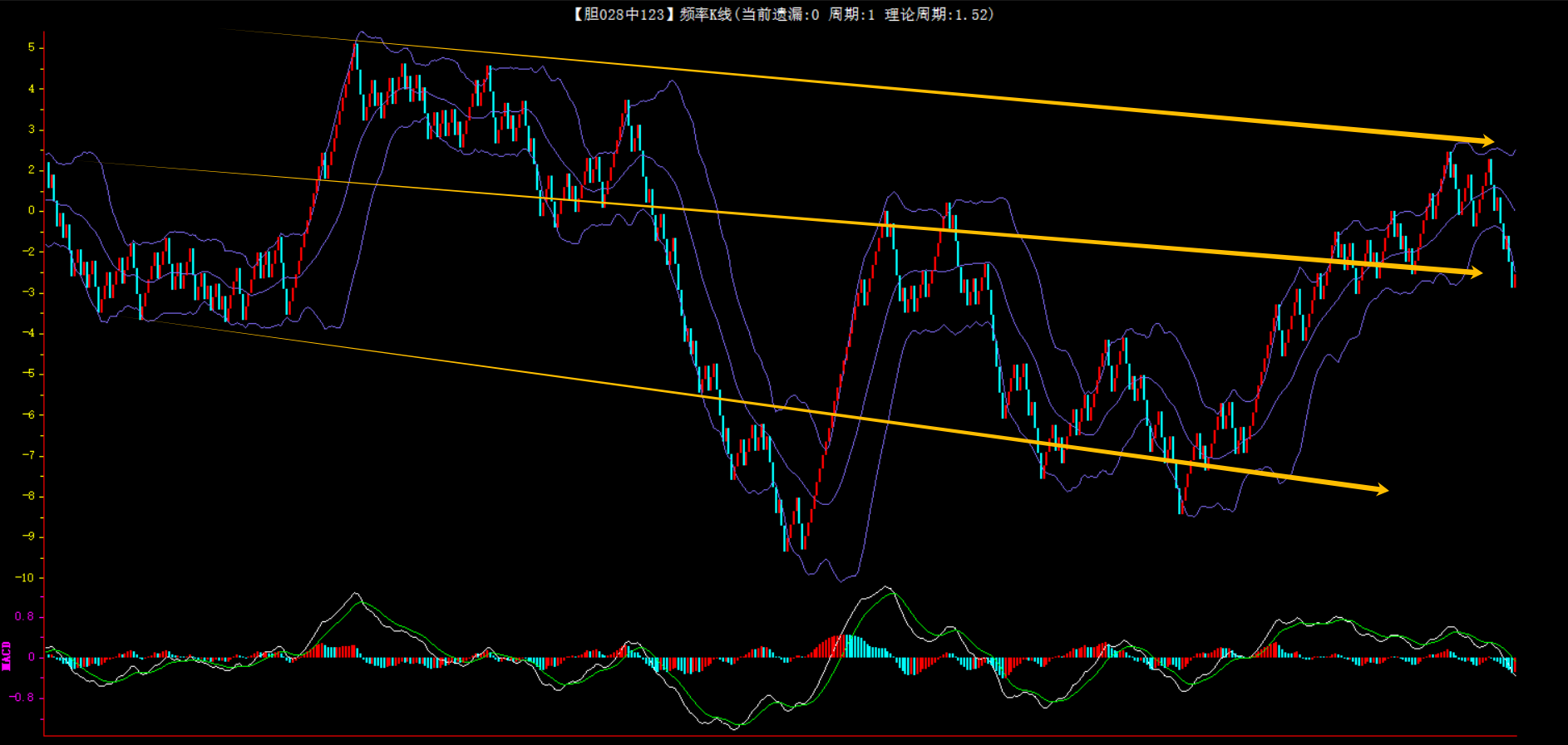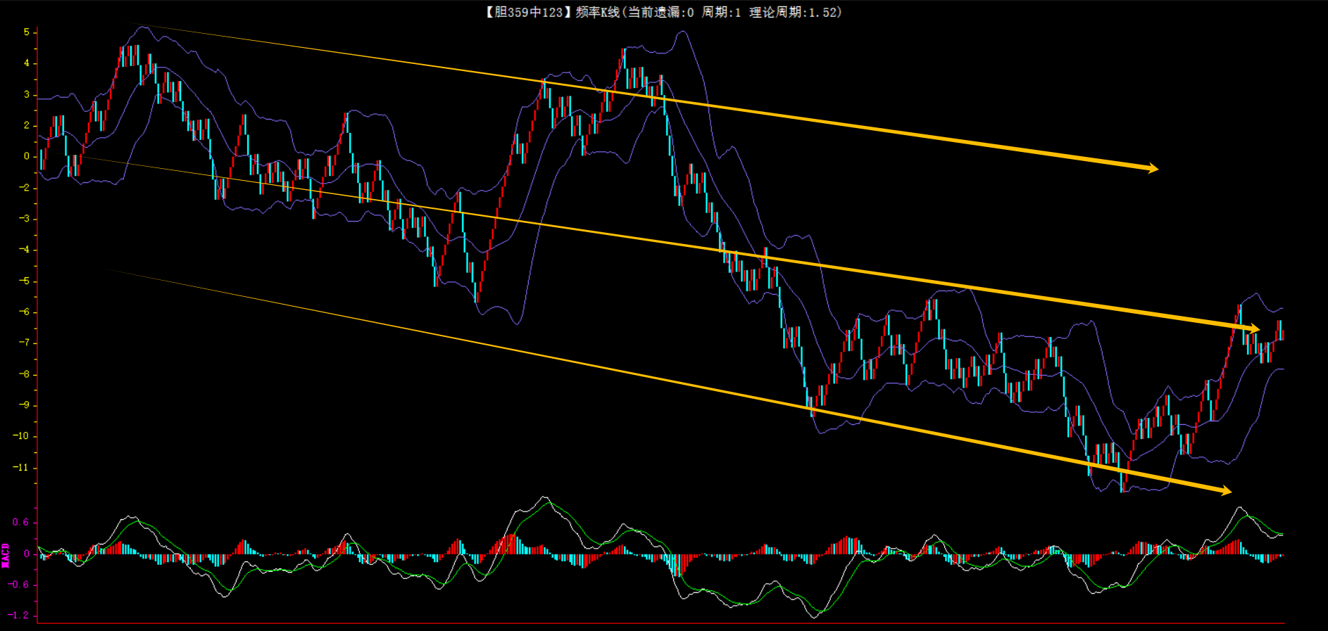 整体趋势下行,上边沿线趋势向下,下边沿趋势也是向下,节点震荡,当前开1期,本期防守。