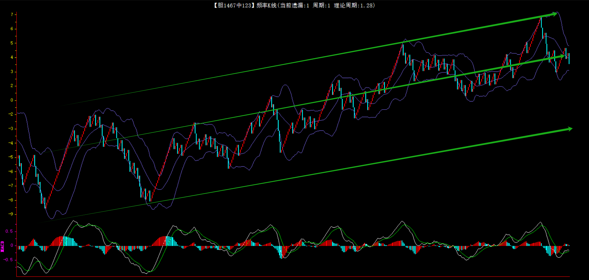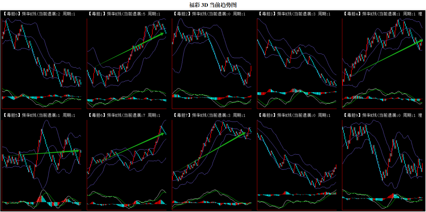 整体趋势上行,上边沿线趋势向上,下边沿趋势也是向上,节点震荡,当前遗漏1期,本期关注。