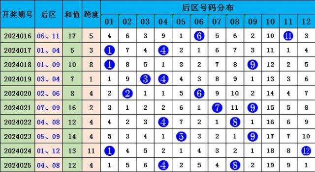 后区上期开出奖号04和08,为偶偶组合。近5期后区奇偶比为5:5,大小比为6:4。本期预计大大、奇奇组合热出,参考两码:07 11。
