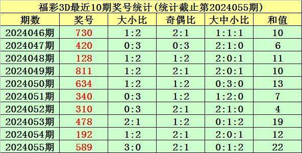 开奖回顾:福彩3D第2024055期奖号为:589。奖号类型为组六,和值为22,奇偶比为2:1,跨度为4,012路比为1:0:2,大小比为3:0。