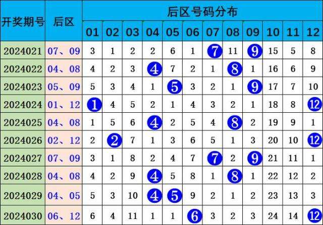 前二区(13-24):最近10期共开出17个号码,出号较温,该区奖号本期关注:15、22。