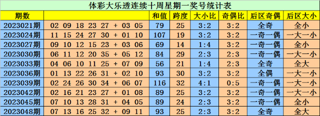 前区大小比推荐:最近10周星期一前区大小奖号总比例为24:26,其中有5期大号热出,有5期小号热出,大小号码出号比例相当,最近3周星期一奖号大小比分别为3:2、2:3、2:3,本周星期一注意大号热出,看好大小比3:2。