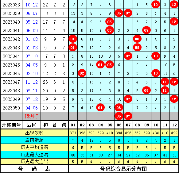 后区分析:最近10周星期一后区号码奇偶比为12:8,奇数号码走势较热,号码大小比为9:11,大小号码开出比例基本持平,本期后区精选两码06和07。