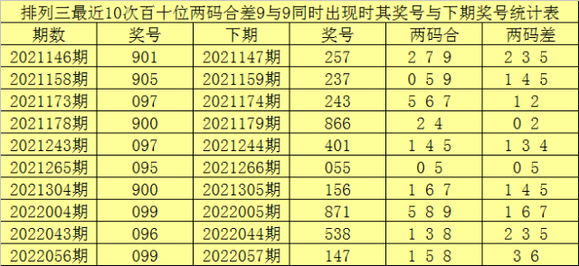 百十位合差分析:上期奖号百十位开出90组合,两码合为9,两码差为9,最近10次百十位两码合9与两码差9同时出现时,其奖号和下期奖号分别为: