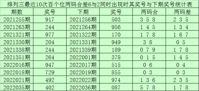 从以上统计可以看出,百个位两码合差6与2同时出现之后其下期两码合差表现最热的4个分别为:0135,本期百个位两码合差可以参考这四码中的数据。