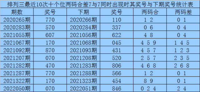 十个位合差分析:上期奖号十个位开出07组合,两码合为7,两码差为7,最近10次十个位两码合7与两码差7同时出现时,其奖号和下期奖号分别为: