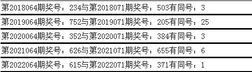 与前期历史同期奖号对比分析,在最近五年开奖中,第064期同期奖号与第071期同期奖号都出现了相同号码: