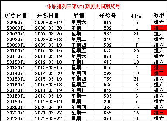 2023年3月22日排列三第071期开奖,历史同期分别开出奖号: