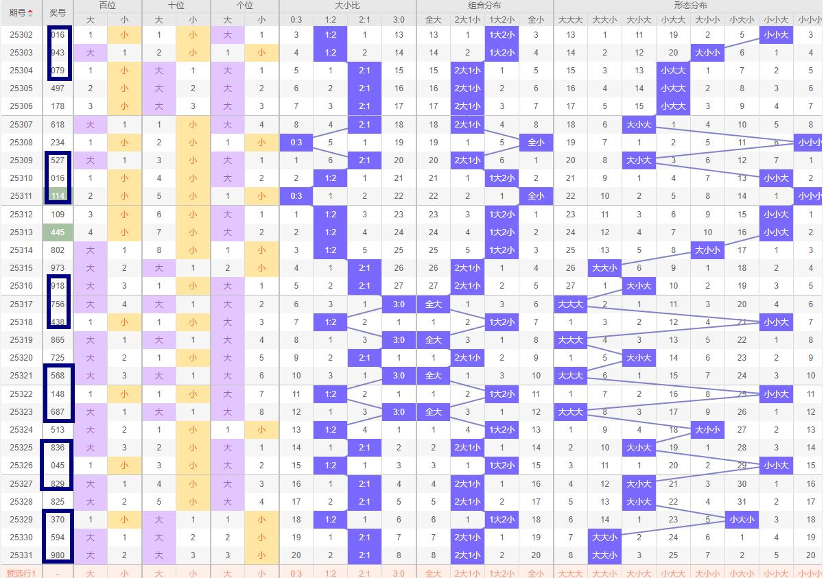 大小走向分析: 在排列3中,大小走势是判断号码分布的重要依据。根据331期开奖结果980,大小比为2:1;形态奇偶偶。结合历史走势图,发现近10期大小比例为17:13,大数保持优势;因此,332期关注的大小比例1:2,可能会出现一个大奖号和两个小奖号,应充分考虑这一趋势,合理分配投注比例。防全小号码.