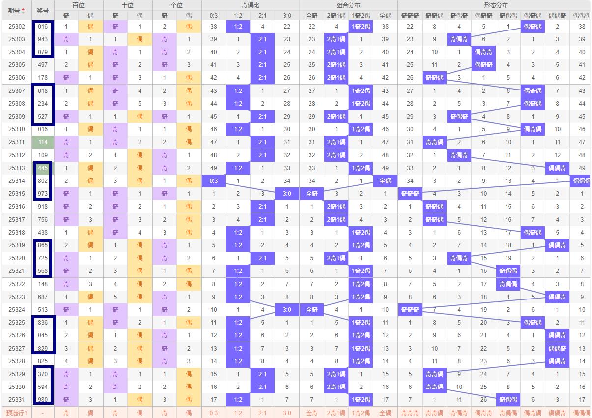奇偶比例分析 奇偶比例同样是排列3分析中的重要一环。331期开奖号码为980奇偶比为1:2,即1个奇数和2个偶数。从近期走势图来看,奇偶比例分布较为均衡,没有出现明显的偏态。因此,本期可以继续关注1:2或者2:1的奇偶比例。可以根据这一比例进行号码筛选。