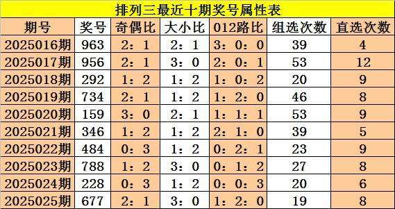 上期回顾:体彩排列三第2025025期奖号:677,奇偶比2:1,大小比3:0,012比1:2:0。