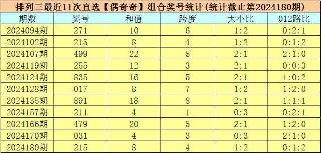 开奖回顾:排列三第2024180期开出奖号:215,类型为组六,和值为8,奇偶比为2:1,大小比为1:2,跨度为4。