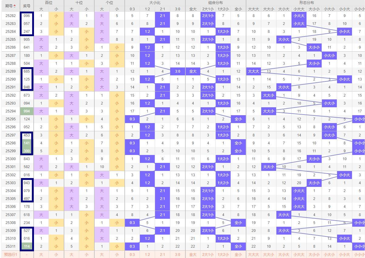 大小走势分析: 在排列3的大小走势中,近期数据显示大小组合分布较为均衡,但细致观察历史数据,发现大小组合呈现出一定的周期性变化。对于第312期预测大小比例可能为1:2或2:1。考虑到近期小号略有增多,建议重点关注大小比例为2:1的组合,即两个大号搭配一个小号。近十期大小比为13:17小数占据优势.