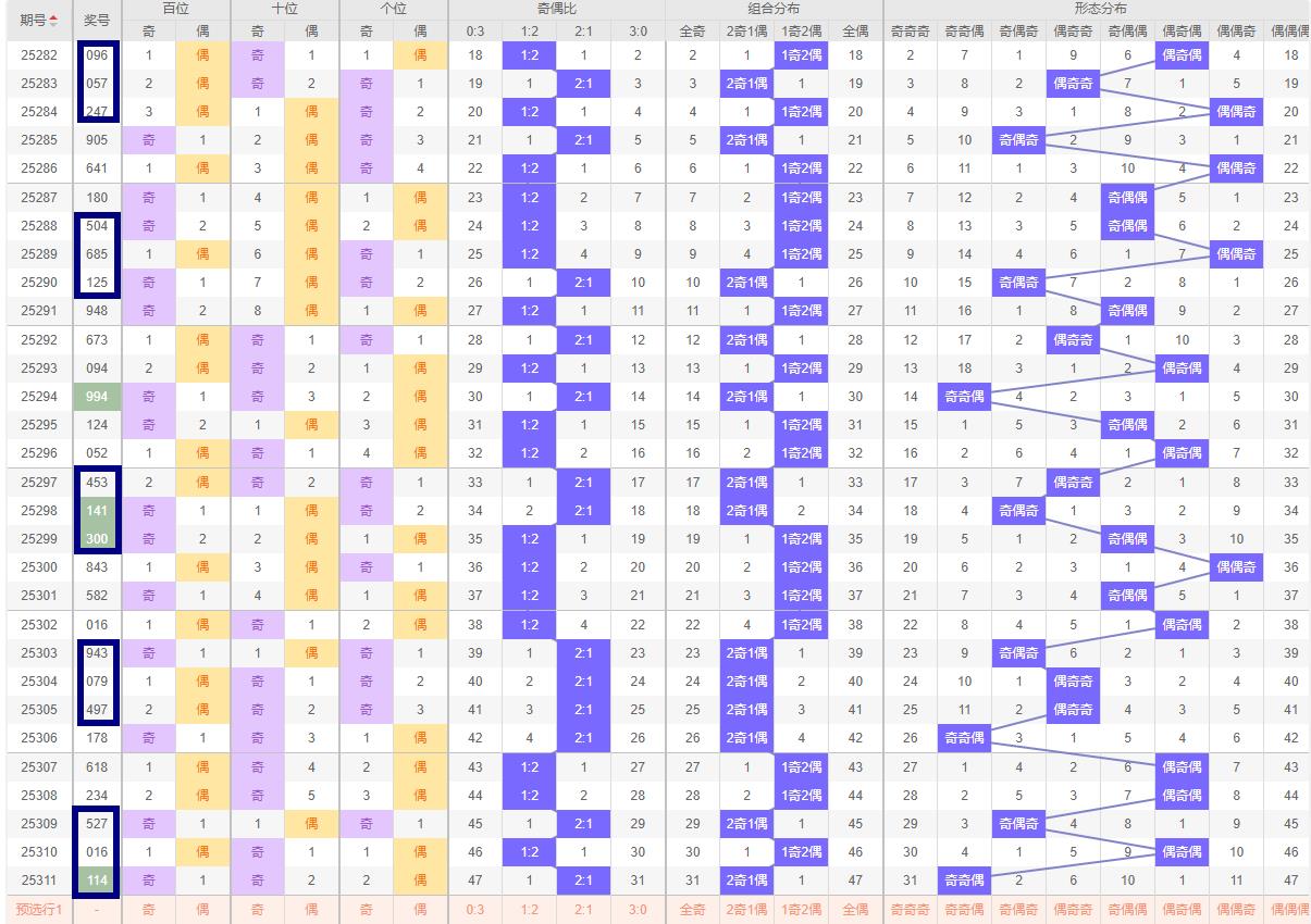 排列3/312期综合分析:311期的开奖号码114,和值6,奇奇偶,小小小,。跨度3的信息,对第312期进行一些走势分析和预判。