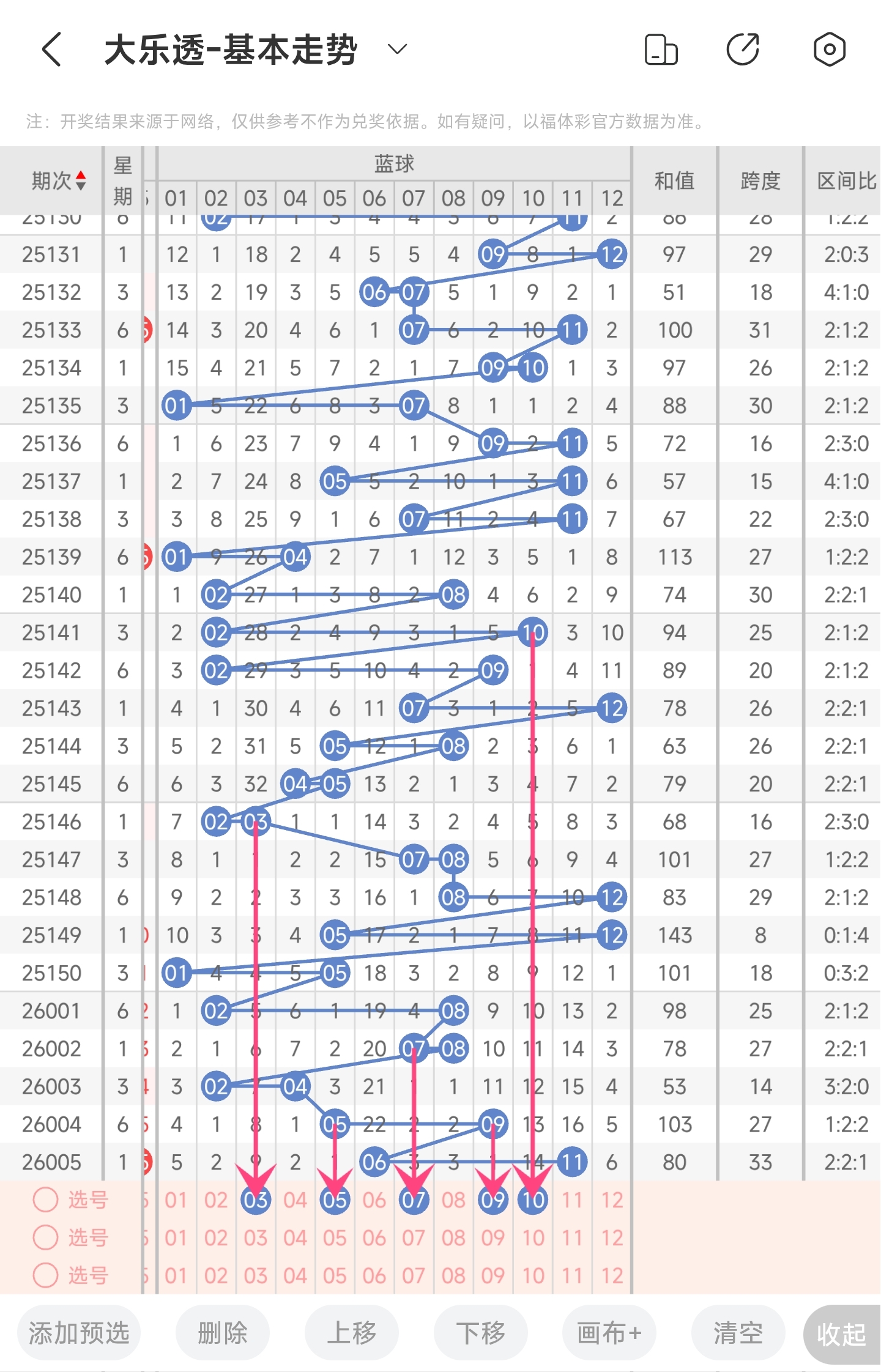 上期龙头为2,凤尾为35,跨度为33。而近5期跨度为25,27,14,27,33。上期跨度为33,往前一期为27,偏移量为6,振幅为6。跨度为33时,跨度值是最近30期内开出的很大的跨度,本期看好跨度变小。所以推测本期跨度大概率变小,小概率会变大。