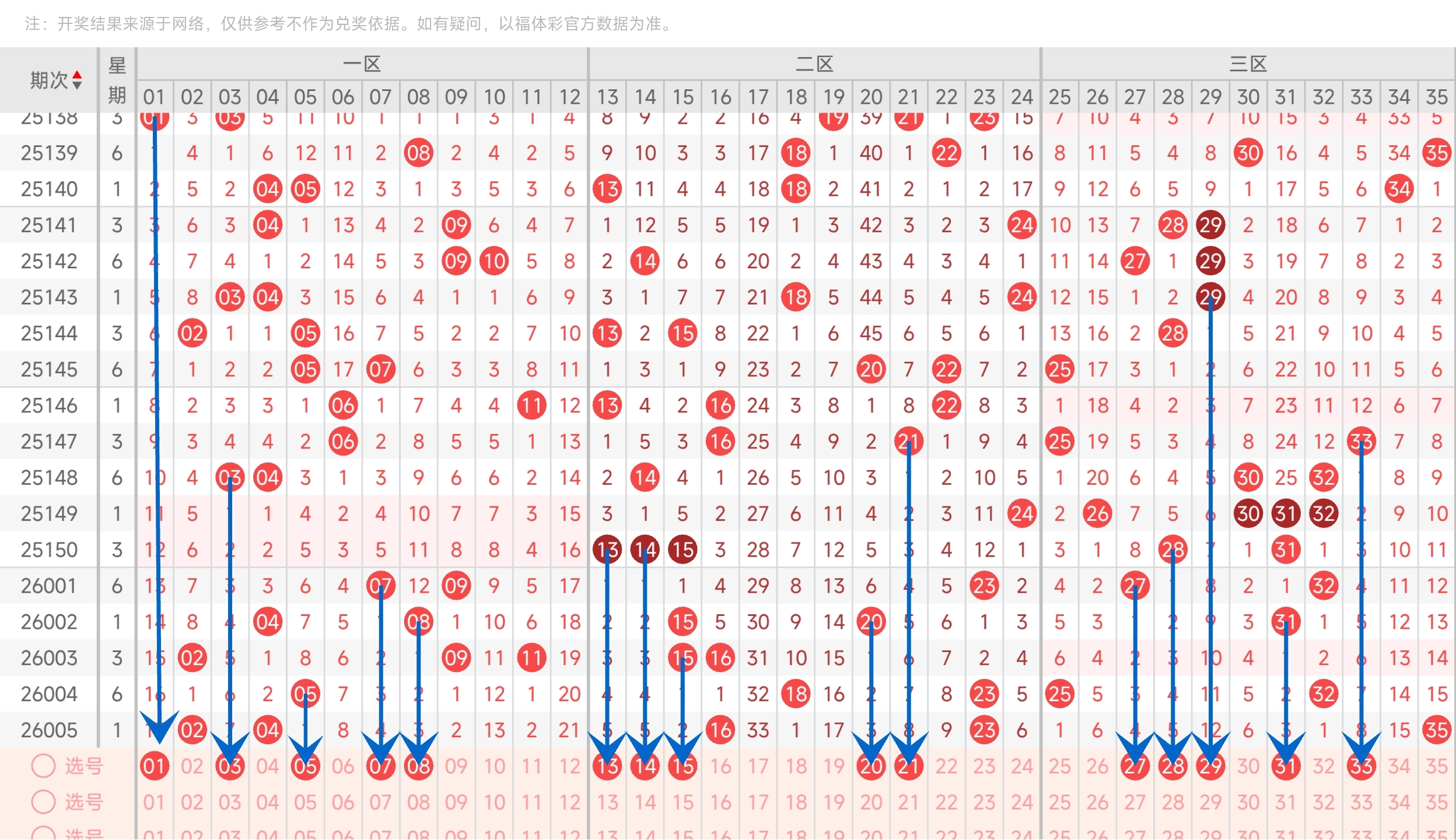 上期开出35号码,往前一期开出了25,32号。通过分析走势图,可以看到上期凤尾开了35,本期凤尾看好往左移动,看好中间和右边的号码。最后再结合冷热号和遗漏期数,本期我们可以关注27,28,29,31,33等号。综上所述本期三区我们推测可能会开27,28,29,31,33等号码。