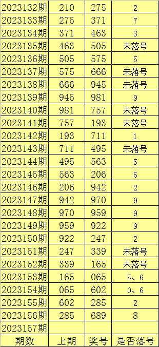 福彩3D第2023156奖号689,重号落号。在最近100期(第2023057期-2023156期)中,重号落号66期;最近20期重号落号概率为65%;最近10期重号落号概率为80%。本期防重号中号码轮空。