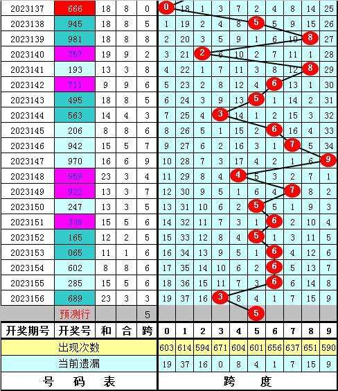 福彩3D第2023156期最大跨度开出3,跨度近期分布比较密集,主要分布在3-6区段,本期预计最大跨度在3-7区段出现,最大跨度关注34567,精选跨度5。