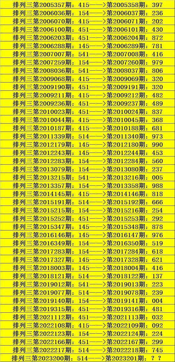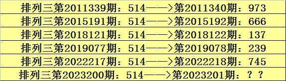第2023200期排列三奖号为514,历史上该号码直选出现6次,下期奖号分别为:973、666、137、239、745。