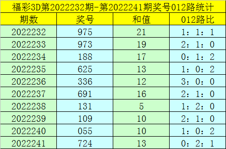 上期回顾:福彩3D第2022241期开出奖号:724。奖号为组六形态,与试机号没有同,奇偶比为1:2,大小比为1:2,012路比为0:2:1,和值为13,跨度为5。