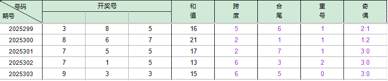2025299期开奖号码385,我们可以看出近30期百位3出现2次,十位8出现1次,个位5出现2次。