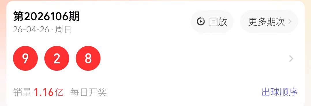 如图所示福彩3D第2026107期开奖结果为 9 2 8