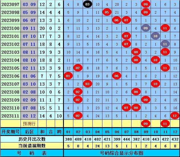 后区分析:上期后区开出2路+0路奖号02+12,最近10期后区奖号012路比为4:5:11,本期继续关注0路号码和2路号码,两码参考09、11。