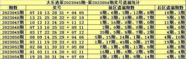 大乐透第2023055期奖号冷温热走势分析(冷码:遗漏值9以上的号码,温码:遗漏值4-9之间的号码,热码遗漏值0-3之间的号码)